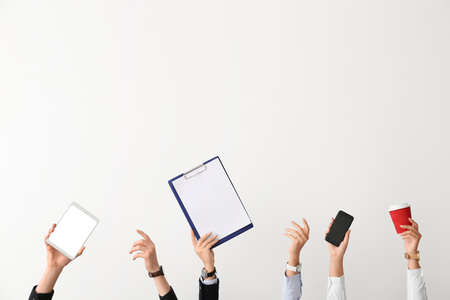 Hands with wrist watches, tablet computer, clipboard, cup and mobile phone on light background
