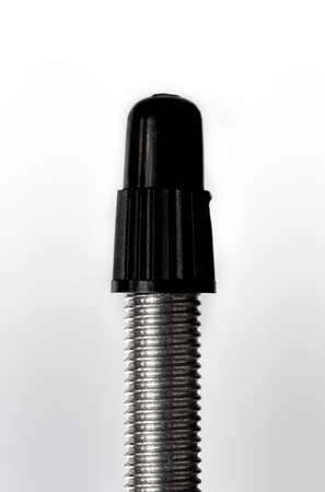 The valve in the car wheel. Replacement and service of tires in a passenger car Dark background.