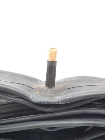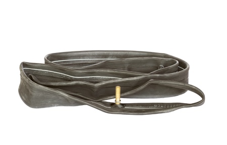 Old deflated Rubber Tire Tube for Bicycling with valve isolated on white background.