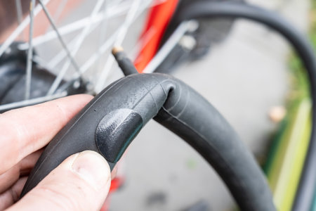 Bicycle inner tube repair. A person is applying vulcanization patch on inner tube in order to fix the puncture of the inner tube.