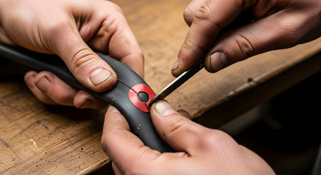 A close-up of a person's hands repairing a puncture in a bicycle inner tube. They are using a metal tool to roughen the surface around the hole before applying a patch, demonstrating a common bike maintenance task.
