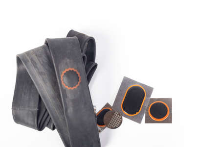 Bicycle tube, glue and patches in the workshop. Repairing a damaged wheel in a bike. Light background.