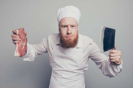 Portrait of he crazy nice attractive handsome suspicious butcher