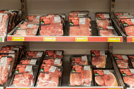 Pork on Tray in Supermarket, Raw Food. Closeup and Selective Focus