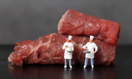 Uncooked beef and two miniature chefs. Miniature people and Uncooked beef with business concept.