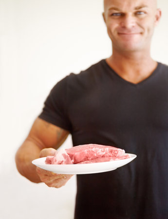 Making sure he gets enough protein in his diet. Portrait of a bodybuilder holding out a plate of raw beef.