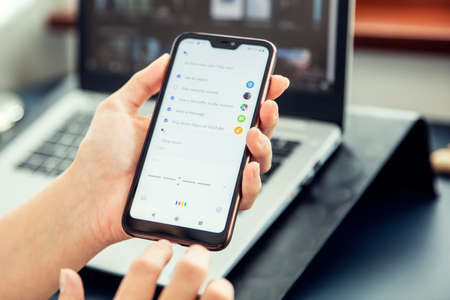 WROCLAW, POLAND - JULY 31th, 2019: Woman uses google assistant on xiaomi a2 smartphone. Google Assistant is an artificial intelligence-powered virtual assistant developed by Google