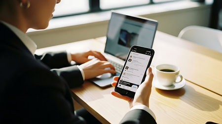 close up of woman using mobile phone and laptop at table in cafe