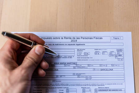 Barcelona, Spain - 20 april 2020: hand filling declaracion de la renta form for spanish tax declaration a symbol of coronavirus and spanish economy and freelancers