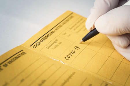 the doctor writes the word covid-19 the name of the disease from which there is a vaccination. , international, certificate, vaccination, vaccine,