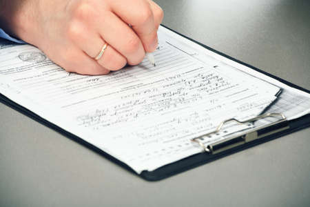 Woman customer filling property reservation form, date of birth, personal information,email, nationality on the table at the office. Close up. Selective focus.