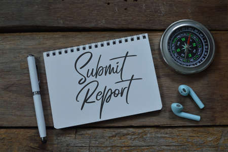 Selective focus of notebook written with text SUBMIT REPORT.