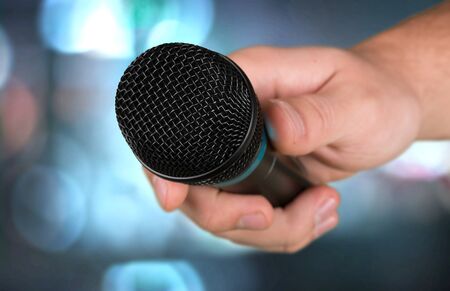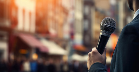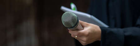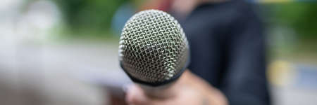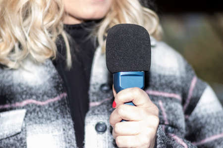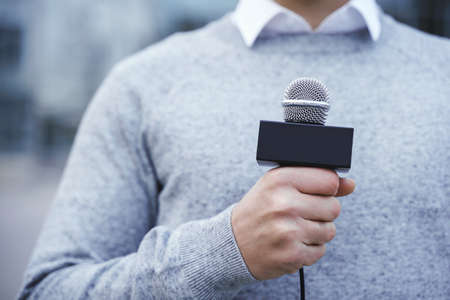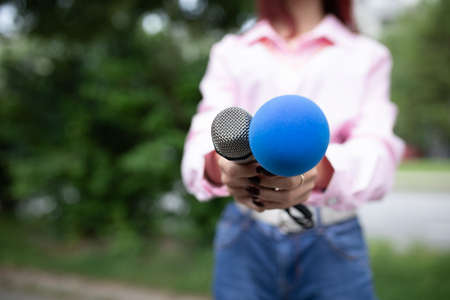 Reporter holding microphone making media interview. Street interview or vox popoli.