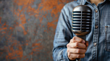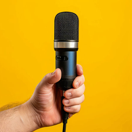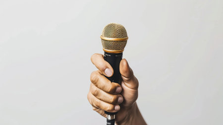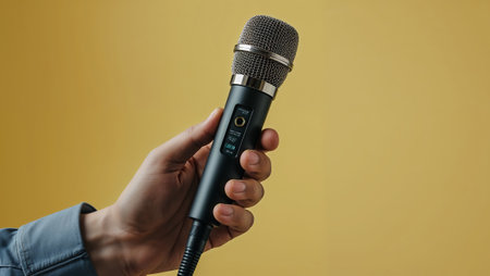 Hand holding a professional microphone, ready for an interview or recording. Ai generated image