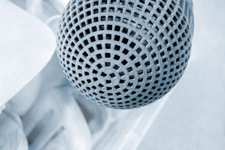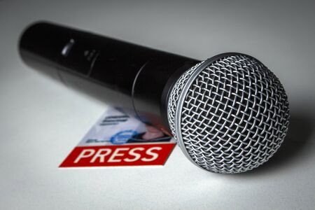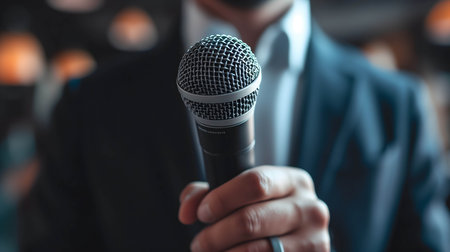 Close-up of a reporter's microphone in the hands of a correspondent in a gray or dark blue suit. AI generative