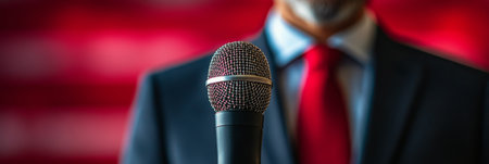 A well-dressed speaker stands confidently, holding a microphone, in front of a visually striking red background. The atmosphere suggests a formal public address or presentation.