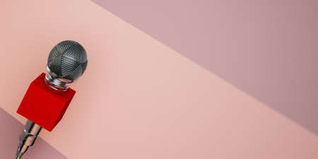 studio microphone on a blue pink background, panoramic mock-up with space for text