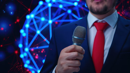 A professional presenter stands confidently holding a microphone against a dynamic technology background, symbolizing communication and innovation in modern events.