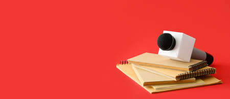 Professional journalist with microphones and notebook indoors, closeup. Black and white effect