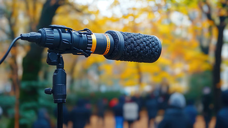A detailed view of a shotgun microphone positioned on a stand amidst a colorful autumn background, ideal for capturing high-quality audio in outdoor settings.