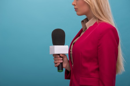 Half-length portrait of fair-haired serious TV presenter wearing great red jacket and cream-colored shirt standing aside with the microphone. Isolated on blue background