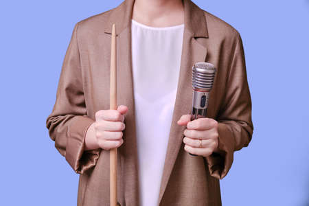 Woman teacher holding microphone in hand on studio blue background, copy space