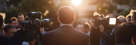 A politician delivers an impactful statement surrounded by eager journalists and camera flashes under warm sunlight, creating an engaging atmosphere.