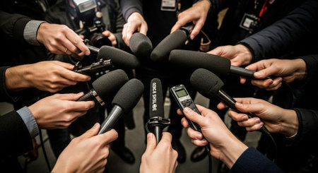 Numerous hands hold microphones and voice recorders towards a table with a PRESS sign, capturing audio at a busy...