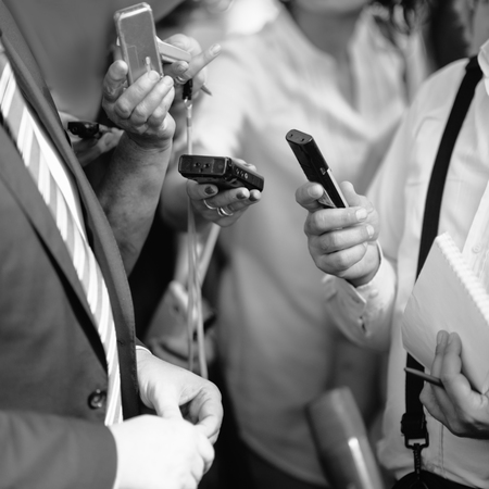 Reporters at press conference holding microphone and smartphone making media interview with unrecognizable politician or business person