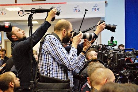 Warsaw, Poland. 24 October 2023. Group of professional journalists and reporters with video and photo camera for reportage and live stream. The presidential palace.