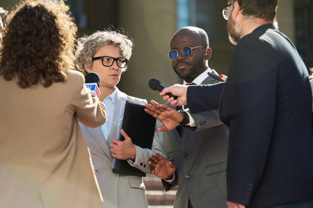 Caucasian middle aged woman and Black young man standing outdoors being interviewed by group of journalists holding microphones and recording devices in professional setting