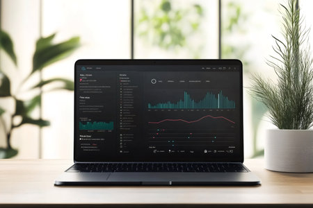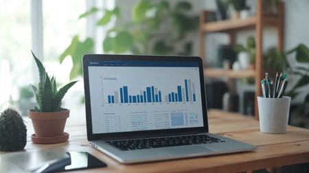 Contemporary workspace highlighting a laptop with data analytics open on the screen, surrounded by plants and office essentials, conveying a productive atmosphere.