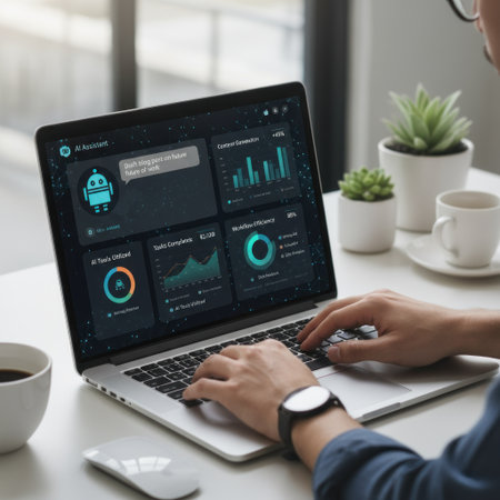 Explore AI analytics on a sleek laptop showcasing performance metrics in a modern home office environment.