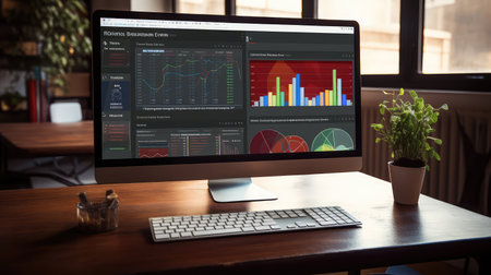 A modern workspace featuring a sleek computer displaying colorful charts and graphs alongside a coffee mug, indoor plants, and a wooden desk. Ideal for business analysis.