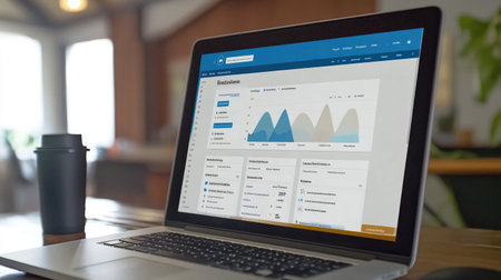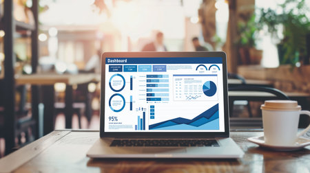 Modern Laptop Displaying Data Analysis Dashboards in a Bright Cafe Environment with a Cozy and Inviting Atmosphere for Business Professionals