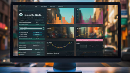 High-resolution image of a sleek data dashboard on a computer monitor showcasing financial analysis with various statistical graphs and trends.