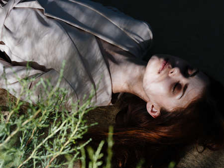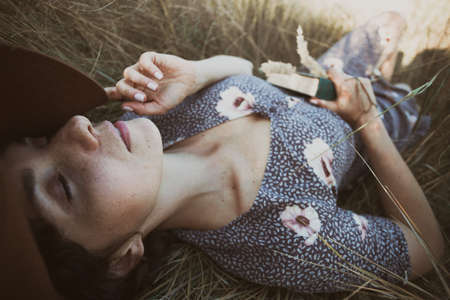 A magic girl with closed eyes lies in a field on the grass and enjoys the sounds of nature.