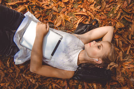 Pretty teen girl is relaxing on autumn leaves with digital tablet and listening music