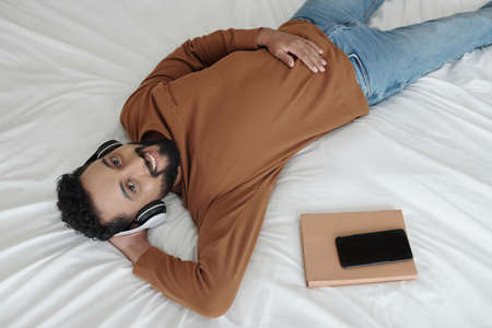 Happy bearded man in casual clothes relaxing on bed, listening to music in headphones and looking up at camera