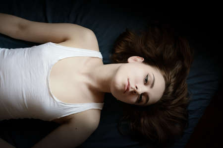 Young attractive caucasian woman relaxing on a bed in sunlight.