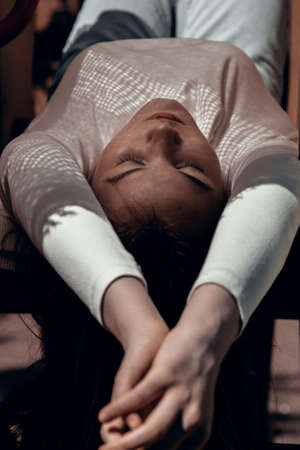 Portrait of beautiful girl with closed eyes. Woman with shadows on her face. Concept of sunbathing, relaxation. High quality photo