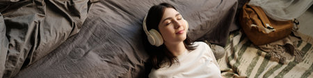 Young Caucasian woman relaxing on bed listening to music with headphones eyes closed, appearing peaceful lying on blanket next to bag in cozy indoor setting