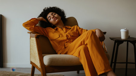 A serene moment of a woman in a stylish yellow outfit, resting in a cozy chair. The soft lighting enhances the calm atmosphere, ideal for relaxation.