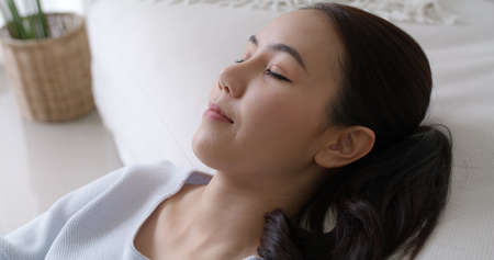 Close-up face of beautiful asia lady people take a break nap sitting on floor lean back and head on cozy sofa couch. Enjoy deep warm time fresh in good happy life and stress relief at home.
