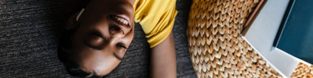 Smiling african-american girl listening to music in earphones, lying on floor, relaxing at home, top view