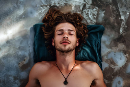Top view of a handsome young man lying down with his eyes closed. Wellness concept.