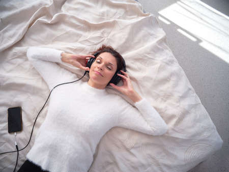 Woman relaxed on the bed with eyes closed and listening to music with the mobile