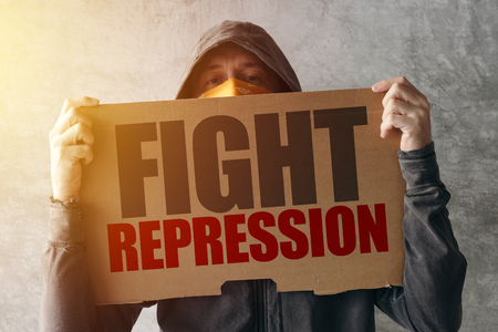 Hooded activist protestor holding Fight repression protest sign. Man with hoodie and scarf over face taking part in activism and fighting for the cause.