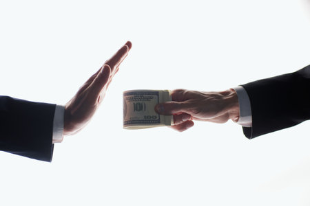 Businessman hand give the bribe to government officials who raise the hand refusing money the concept of corruption and anti-bribery.
