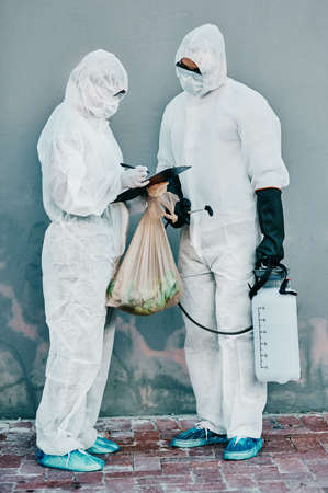 The virus fighting unit. Shot of two healthcare workers wearing hazmat suits working together during an outbreak in the city.